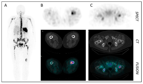 CXCR4-targeted SPECT/CT imaging in a patient with multiple myeloma (MM) using [99mTc]PentixaSPECT. (A) MIP at 3 h p.i. (B,C) Axial SPECT, CT and fusion images of intramedullary MM lesions in the femur (B) and the femoral head (C) (3 h p.i.) [78].