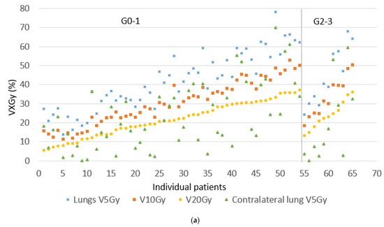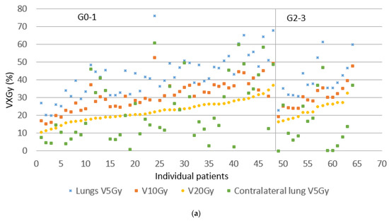 Dosimetric values for sCRT/RT for individual patients. (a) Variation in V5–25 Gy total lung minus PTV, and V5 Gy contralateral lung, ordered according to an increasing V20 Gy total lung minus PTV, separated in grade 0–1 and 2–3 radiation pneumonitis. (b) Variation in V20–60 Gy esophagus, ordered according to an increasing V20 Gy esophagus, separated in grade 0–1 and 2–3 esophagitis.