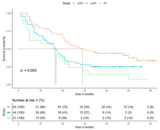 Details of patients with stage III NSCLC between 2015 and 2017, prior to the introduction of immunotherapy, were retrospectively retrieved from an institutional database [22]. Patients gave consent to the use of their data and the study was approved by the Institutional Review Board. Patients were eligible for analysis if they were medically or technically inoperable (i.e., surgery was not part of their treatment strategy determined at the tumor board) and had undergone treatment with radical intent using cCRT, sCRT, or RT alone, planned to a total dose ≥ 50 Gy delivered in ≥15 fractions. Patients were excluded if they subsequently underwent surgery or had prior radiotherapy to the thorax or neck. Multidisciplinary tumor board recommendations were consistent with ESMO guidelines [23]. The following IMRT/VMAT approaches were used during this period: (i) Hybrid-IMRT (hIMRT), (ii) full VMAT (RapidArc; Varian Medical Systems, Palo Alto, CA, USA), or (iii) hybrid-VMAT (hVMAT) [12,13]. For the present analysis, toxicity follow up was until May 2020 and survival until October 2020. Esophageal, pulmonary, and cardiac events were retrospectively scored according to the Common Terminology Criteria for Adverse Events (CTCAE v. 5.0) [22]. Tumor staging was done according to the American Joint Committee on Cancer (AJCC) [24].