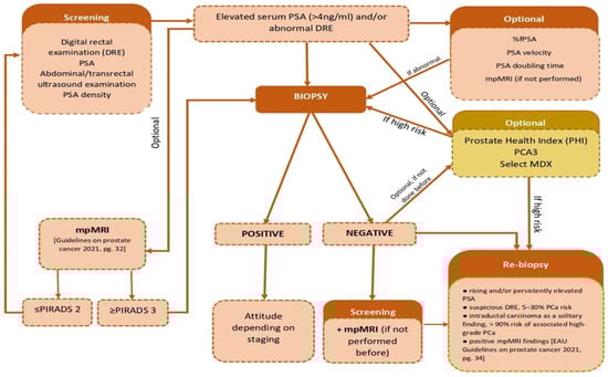 Prostate cancer (PCa) was in 2020 the second most common cancer and the fifth leading cause of death among the male population worldwide, accounting for 6.8% of all male cancer mortality []. The highest incidence rates (between 83.4 and 62.5 per 100,000 men) were reported in Northern and Western Europe, the Caribbean, Australia/New Zealand, North America, Southern Africa, and South America, while the lowest rates were in Asia and North Africa []. In Eastern Europe, the incidence and mortality rates were 46.4/100,000 (ASR) and 13.7/100,000 (ASR) respectively []. In Romania in 2020, there was an incidence rate of PCa of 41.5/100,000 (ASR) with a mortality rate of 10.7/100,000 (ASR) []. The well-established risk factors are older age, family history of the disease, and black race or ethnicity []. In addition, genetic mutations, such as changes in the breast cancer gene 2 (BRCA2), checkpoint kinase 2 (CHEK2), ataxia telangiectasia mutated (ATM), and the breast cancer gene 1 (BRCA1) are present in diagnosed patients with PCa []. The presence of genetic conditions such as hereditary prostate cancer (HPC), hereditary breast and ovarian cancer syndrome (HBOC) or Lynch syndrome strongly recommends genetic testing in patients with suspicion of PCa []. Diet habits may play a role in PCa—a high consumption of tomatoes and lycopene, soy products, fish, green tea, and coffee having a prevention effect for PCa, while the abuse of grilled or fried meat, dietary supplements, and alcohol represent risk factors for PCa []. Patients with diabetes mellitus [], especially those treated with metformin [], have a lower risk of PCa, compared to the normal population. Exposure to Agent Orange (a herbicide extensively used in the Vietnam War), has been associated with a high risk of aggressive PCa []. PCa is linked with increased incidence and mortality in the heavy smoker population []. Inflammatory bowel disease [] and gonorrhea infection [] could also be considered risk factors for PCa.