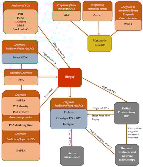 In this review, the authors have highlighted some of the numerous promising biomarkers commercially available and used to improve the PCa detection in patients with elevated PSA. Although PSA is currently the most broadly prostate cancer biomarker used for screening, other tests have been introduced into common practice and are being performed more and more extensively (Figure 2).