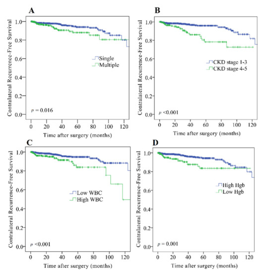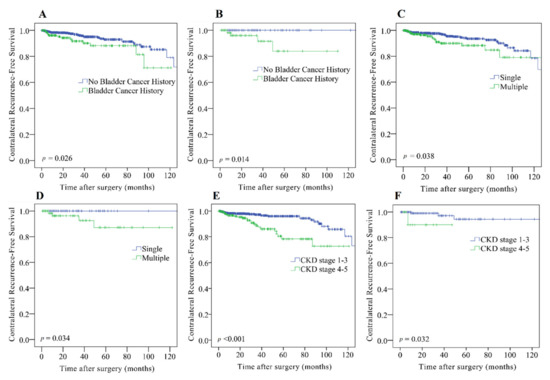 - Kang, C.H.; Yu, T.J.; Hsieh, H.H.; Yang, J.W.; Shu, K.; Huang, C.C.; Chiang, P.H.; Shiue, Y.L. The development of bladder tumors and contralateral upper urinary tract tumors after primary transitional cell carcinoma of the upper urinary tract. Cancer 2003, 98, 1620–1626. [Google Scholar] [CrossRef]