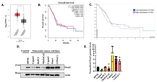 3.1. Orai3 Expression Is Inversely Correlated to the Pancreatic Cancer Patients Survival