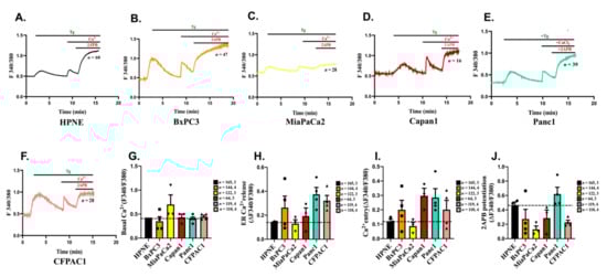 Calcium imaging was performed as reported earlier [34,35]. Briefly, cells were cultured on confocal dishes for performing Ca2+ imaging. Cells are incubated at 37 °C for 30 min in a culture medium containing 4 μM fura-2 AM. After incubation, cells were washed 3 times and bathed in HEPES-buffered saline solution (140 mM NaCl, 1.13 mM MgCl2, 4.7 mM KCl, 2 mM CaCl2, 10 mM d-glucose, and 10 mM HEPES; pH 7.4) for ≥5 min before Ca2+ measurements were made. A digital fluorescence imaging system (Nikon Eclipse Ti2 microscope coupled with CoolLED pE-340 Fura light source and a high speed PCO camera) was used, and fluorescence images of several cells were recorded and analyzed. Fura-2AM was excited alternately at 340 and 380 nm, and the emission signal was captured at 510 nm. Figures showing Ca2+ traces are an average from several cells (the number of cells is denoted as “n” on each trace) attached on a single imaging dish. Each experiment was performed at least 3–4 times and the final data are plotted in the form of bar graphs. In the case of Panc1 stables, 9–11 runs on 3 independent days were performed. The data shown in a particular trace originates from multiple cells on a single imaging dish. The exact number of cells and traces for each condition are specified in the respective figure.