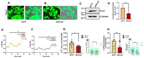 For corroborating the role of Orai3 in SOCE, we generated lentiviral-based stable Panc1 cell lines expressing either non-targeting control shRNA (shNT) or shRNA specifically targeting Orai3 (shOrai3). We used the shRNA vectors co-expressing GFP for fluorescence-based identification of transduced cells and for performing in vivo bio-fluorescence studies (Figure 3A,B). First of all, we confirmed Orai3 silencing in shOrai3 stable Panc1 cell line by performing Western blot analysis (Figure 3C). We observed a significant knockdown of Orai3 in shOrai3 stable cells in comparison to shNT cells (Figure 3D). Next, we examined the specificity of shOrai3 by analyzing the mRNA and protein expression of Orai3 homologs, i.e., Orai1 and Orai2 in shOrai3 Panc1 stable cells. As presented in Supplementary Figure S1A, in Panc1 shOrai3 stables Orai3 mRNA levels were decreased by over 50% in comparison to that in shNT Panc1 cells. Whereas Orai1 and Orai2 mRNA levels remain comparable between shNT and shOrai3 Panc1 cells (Figure S1A). We also corroborated shOrai3 specificity at protein levels by performing Western blot analysis for Orai1 and Orai2 in Panc1 stable cells. As expected, we observed similar levels of Orai1 and Orai2 in shNT versus shOrai3 Panc1 stable cells (Figure S1B–E). Taken together, these experiments clearly demonstrate that shOrai3 is specific to Orai3. After confirming specificity, we used shNT and shOrai3 Panc1 stable cells for performing live cell Ca2+ imaging experiments. We performed Ca2+ imaging experiments in around 250 cells/condition. As presented in Figure 3E, shNT Panc1 stable cells showed SOCE that was potentiated upon 2APB application whereas shOrai3 Panc1 stable cells displayed lower SOCE as well as reduced 2APB mediated potentiation (Figure 3F). The detailed analysis of Ca2+ imaging traces demonstrate that Orai3 knockdown in Panc1 cells significantly decrease both SOCE and 2APB induced SOCE potentiation (Figure 3G,H). Interestingly, 2APB (50 µM) can activate Orai3 independent of Ca2+ store depletion. Therefore, we performed additional Ca2+ imaging assays in shNT and shOrai3 Panc1 stable cells wherein we directly stimulated cells with 2APB (50 µM) without Tg pre-exposure. As shown in Supplementary Figure S2A,B, 2APB activated Ca2+ influx in shNT Panc1 stables and this influx was significantly decreased in shOrai3 Panc1 cells. We analyzed 2APB stimulated store independent Ca2+ entry in around 150 cells/condition. The quantitation of this data is presented in Supplementary Figure S2C. Collectively, our live cell Ca2+ imaging experiments clearly show that Orai3 is a functional SOCE channel in Panc1 cells.