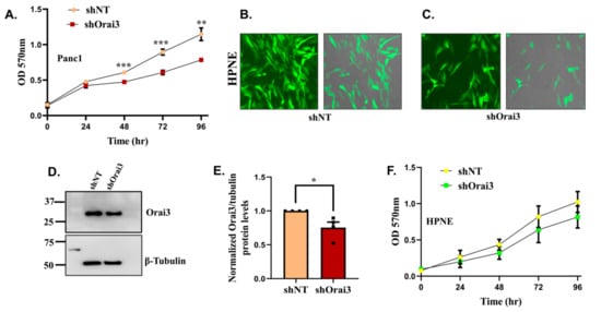For understanding the role of Orai3 in PC progression, we started by evaluating Orai3 contribution to PC cell viability. We performed a colorimetry-based MTT assay for examining the significance of Orai3 in Panc1 viability. As presented in Figure 4A, the cell viability was significantly decreased in shOrai3 Panc1 stables in comparison to shNT stables. We next sought to determine if Orai3′s role in regulating cell viability is specific to PC cells or is it conserved in “normal” pancreatic epithelium. Therefore, we generated lentiviral-based stable silencing of Orai3 in HPNE cells. We used similar strategy as discussed above for Panc1 cells and generated shNT control stable HPNE cells and shOrai3 stable HPNE cells (Figure 4B,C). We performed Western blot analysis to confirm the knockdown of Orai3 in HPNE cells (Figure 4D) and observed that there was a significant reduction in Orai3 expression in shOrai3 HPNE stable cells in comparison to shNT control cells (Figure 4E). We then performed MTT assays on these HPNE stable cells and found that Orai3 knockdown only marginally (non-significantly) affected the viability of “normal” pancreatic cells (Figure 4F). This suggests that Orai3 specifically contributes to the cellular viability of PC cells. We thus performed further functional assays with Panc1 shNT and shOrai3 stable cells.