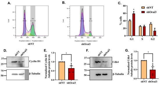 The decrease in cell viability observed upon Orai3 knockdown in Panc1 cells could be either due to decrease in cell cycle progression or increase in basal cell apoptosis. Thus, we performed both cycle cell analysis and cell apoptosis estimation in shNT and shOrai3 Panc1 cells. We carried out standard propidium iodide-based FACS measurements of the cell-cycle progression in Panc1 shNT and shOrai3 cells (Figure 5A,B). Interestingly, we observed that Orai3 silencing led to accumulation of Panc1 cells in the G1 phase of cell cycle and there were substantially less cells in G2 phase in comparison to shNT stable cells (Figure 5C). In shNT Panc1 stables, cells were able to transit to the S and G2 phases of the cell cycle while in the case of shOrai3 stables, the majority of cells (>50%) were stalled in the G1 phase suggesting that Orai3 silencing induces cell-cycle arrest in the G1 phase (Figure 5C). To further corroborate this observation, we examined the levels of key G1 phase transition regulators, i.e., cyclin D1 and cyclin dependent kinase 4 (Cdk4) in shOrai3 stables. We performed Western blot analysis in shNT and shOrai3 stables for evaluating cyclin D1 and Cdk4 expression. As expected, the expression of both cyclin D1 (Figure 5D,E) and Cdk4 (Figure 5F,G) was significantly decreased in shOrai3 stables in comparison to shNT control cells suggesting that Orai3 plays a critical role in the G1 phase transition of PC cells.