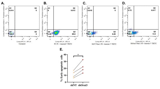 Next, we examined the role of Orai3 in modulating PC cell apoptosis by performing standard annexin V-based FACS assays. Since our stable cells were constitutively expressing GFP, we used TRITC conjugated annexin V to ensure that there was no spectral overlap between live and apoptotic cells in our experiments. This strategy helped in ruling out the possibility of any false positive apoptotic signals during FACS analysis. We used unstained cells and cells heated at 95 °C as negative and positive controls, respectively, in the apoptosis assays. As presented in Figure 6A,B, we observed 0% and 95.6% early apoptotic cells in the negative and positive controls, respectively. It suggests that our assay was working efficiently, and we were able to capture correct biological signals using TRITC conjugated annexin V. We then evaluated basal cellular apoptosis in shNT (Figure 6C) and shOrai3 Panc1 stables (Figure 6D) and found that there was a two-fold increase in the number of apoptotic cells in shOrai3 condition as compared to shNT cells (Figure 6E). Taken together, this data suggests that Orai3 plays a vital role in PC cell survival and therefore, Orai3 silencing leads to significant increase in the cellular apoptosis of Panc1 cells.