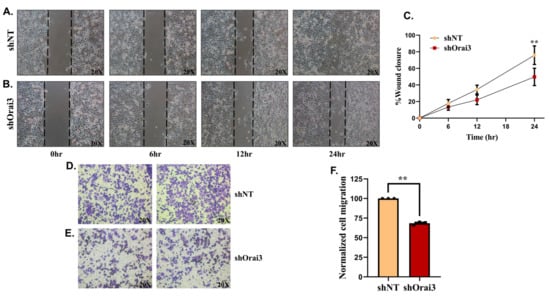 Since most of the PC associated deaths are due to PC metastasis to the secondary sites, we started evaluating the relevance of Orai3 in PC cell migration. We first utilized scratch wound assays for examining the role of Orai3 in Panc1 cell migration. We allowed shNT and shOrai3 stable Panc1 cells to form a monolayer in 24-well plates and then created a wound in the monolayer using 200 µL pipette tip. We observed the wound closure, which gave an estimation of cellular migration at regular intervals until the 24-h timepoint. It is important to mention that the doubling time of Panc1 cells is >50 h (documented at the ATCC website as well). Therefore, in this assay our observations were specific to Panc1 cell migration. As shown in Figure 7A,B, shNT Panc1 stable cells were able to migrate and close the wound more efficiently than shOrai3 Panc1 stables. We performed this assay in triplicates with four independent biological samples and observed that shNT Panc1 stables were able to close around 80% of the wound in 24 h whereas shOrai3 cells closed just over 40% of the wound in the same time (Figure 7C). This suggests that Orai3 could be playing an important role in driving PC-cell migration. To further substantiate this observation, we performed trans-well Boyden chamber-based migration studies with shNT and shOrai3 stable Panc1 cells. We seeded either shNT or shOrai3 cells in the top chamber (with 8 µm pores) containing culture media without serum and used complete media including serum in the bottom chamber. Therefore, in these assays, serum which is rich in growth factors served as a chemoattractant. We allowed cells to migrate towards the lower chamber for 24 h and fixed the migrated cells using formaldehyde. Eventually, migrated cells were stained with crystal violet and quantitation of number of migrated cells was performed using ImageJ software. As presented in Figure 7D,E, the cell migration (crystal violet staining) is substantially less in the case of shOrai3 stables in comparison to shNT stables. Further, the quantitation of data from three independent biological samples suggests that Orai3 silencing results in around 35% decrease in the Panc1 cells migration in trans-well assays (Figure 7F). Taken together, both wound healing and trans-well migration assays highlight a crucial role for Orai3 in regulating PC-cell migration.