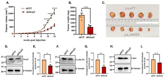 We then attempted to understand the molecular mechanism driving the decrease in the tumor growth in vivo. In our in vitro experiments, we observed that Orai3 regulates cyclinD1 and Cdk4 expression and thereby stall cell-cycle progression. Therefore, we examined if this signaling cascade is functional in the in vivo setting as well. We lysed the snap frozen tumors for making protein samples and performed Western blot analysis on the tumor lysates. First of all, we evaluated the expression of Orai3 in shNT and shOrai3 tumors. We detected close to a 45% reduction in the Orai3 levels in shOrai3 tumors in comparison to shNT tumors (Figure 8D,E). We next examined the levels of cyclinD1 and Cdk4 in shNT and shOrai3 tumor protein samples. In concordance with the in vitro data, the expression of both cyclinD1 (Figure 8F,G) and Cdk4 (Figure 8H,I) was significantly reduced in shOrai3 tumor protein samples in comparison to that in shNT tumor lysates. In summary, this suggests that Orai3 regulates PC tumor growth at least in part by controlling cell-cycle progression.