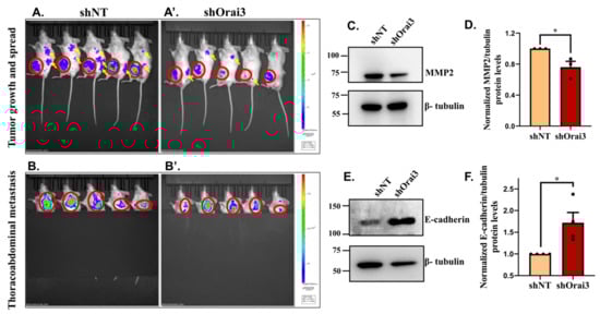 As most of the PC deaths are associated with liver metastasis, and Orai3 expression is inversely correlated with patient survival time (Figure 1), we evaluated the role of Orai3 in driving thoracoabdominal metastasis. For these studies, we covered the site of primary xenografts with black sheet and focused on the thoracoabdominal metastasis. As expected, we observed noticeably higher bio-fluorescence intensity (marked in red circles) in the case of shNT Panc1 stables injected mice (Figure 9B) in comparison to the shOrai3 Panc1 stables injected group (Figure 9B’) suggesting that Orai3 plays a critical role in PC metastasis. We next performed studies for identifying potential mechanisms functioning downstream of Orai3 for regulating PC metastasis. Since metastasis is a very complex phenomenon involving several steps, based on the literature survey suggesting a role for SOCE in regulating MMP expression and EMT [42,43,44,45], we only focused on MMP expression and EMT in this study. Recently, STIM1-Orai1 mediated SOCE was shown to regulate expression of key metastasis associated MMP2 expression [43] in cancerous cells. We thus examined the expression of MMP2 in shNT and shOrai3 tumor lysates. As presented in Figure 9C,D, Western blot analysis of MMP2 protein expression in tumor lysates shows that MMP2 levels are significantly decreased in shOrai3 Panc1 tumors in comparison to shNT Panc1 tumors. We next evaluated levels of E-cadherin, an epithelial marker whose levels are inversely associated with EMT, in shNT and shOrai3 tumor lysates. Western blot analysis of E-cadherin levels in the tumor lysates shows that E-cadherin levels are considerably lower in shNT tumors as compared to shOrai3 tumors, suggesting a higher level of EMT in shNT condition than that in shOrai3 (Figure 9E,F). These data implicate a critical role of Orai3 in regulating MMP2 expression and EMT progression.