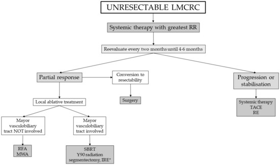 However, only up to 25% of eligible patients undergo resection because of the presence of co-morbidities or unresectability. Non-surgical local therapies, loco-regional or liver-directed therapies are significant therapies for treatment of LMCRC given the response rates to systemic chemotherapy (QT) alone [6]. Although several modern combinations of treatments (5-fluouracil (5-FU)/leucovorin (LV)/oxaliplatin (FOLFOX), 5-FU/LV/irinotecan (FOLFIRI), 5-FU/LV/oxaliplatin/irinotecan (FOLFOXIRI), targeted therapies as anti-epidermal growth factor receptor (EGFR) for RAS wild-type tumors, such as cetuximab and panitumumab and anti-vascular endothelial growth factor (VEGF), such as bevacizumab and aflibercept) have been developed recently, objective response rates (ORR) to first-line treatments for metastatic CRC range from 34% to 66%, and from 30% to 40% for second line [7].