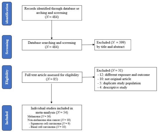 According to the research strategy, a total of 484 records were identified. Of those articles, 399 were excluded by titles and abstracts, and 85 full-text articles were reviewed to assess their eligibility. Twelve studies with different exposures and outcomes, ten studies that were not original articles, five studies with duplicated populations, and four descriptive studies were removed from the 85 full-text articles.