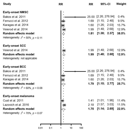 In 2006, the IARC evaluated the dose–response relation between sunbed use and the risk of melanoma [15]. Although the study found that first exposure to sunbeds before the age of 35 years significantly increased the risk of melanoma, the IARC did not find significant evidence for the relation due to the limited number of studies. A recent meta-analysis, including large studies for melanoma published in 2018 [18] and for NMSC in 2012 [19], showed a significant association between indoor tanning and the risk of skin cancer. However, this association was mainly confirmed based on the case–control studies. Each meta-analysis included two cohort studies and only one cohort study, respectively. Although there are several meta-analyses of indoor tanning and melanoma and NMSC, there were limited studies conducted to document the association between indoor tanning and the risk of early-onset melanoma and NMSC. This meta-analysis, using more prospective studies [20,21,22,23,24,25,26,27], provided strong evidence of the causal relationship between indoor tanning and the risk of melanoma and NMSC, respectively. Notably, this association was stronger for the onset at an earlier age. A previous study reported that a young age group (<40 years), which was more frequently female, had more BRAF mutations and less NRAS mutations [28]. Although there are low cumulative UV doses in young adults, the higher prevalence of BRAF mutations is related to a higher risk of an earlier age of onset [29,30]. Based on the different mutational features between younger and older adults, different treatment is recommended to those of an earlier age of onset.