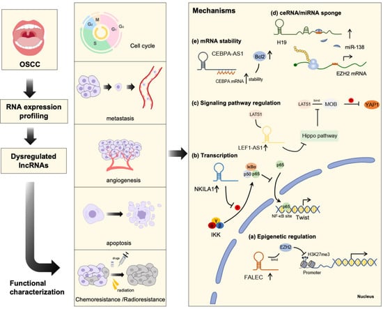Long non-coding RNA in OSCC beginning from identification to characterization of their functions and relevant mechanisms. The first step is to acquire samples of primary tumor and normal tissues from OSCC patients, and then RNA sequencing is applied to screen dysregulated lncRNAs. Furthermore, a series oncogenic and tumor-suppressor functions in tumor biological behaviors such as cell cycle, metastasis, angiogenesis, apoptosis, and drug resistance were identified in vitro and in vivo. Mechanistically, lncRNAs regulate OSCC biological behaviors via the following aspects: (a) Epigenetic regulation. For example, FALEC can recruit polycomb complex EZH2 to specific genomic loci, where they methylate H3K27me3 to induce chromatin compaction and affect transcriptional activity. (b) Transcription regulation. For example, NKILA interacts with transcription factors NF-κB to block the action of transcription factors, thus repressing Twist expression. (c) Signaling pathway regulation. LEF1-AS1 interacts with LATS1 protein to inhibit the Hippo signaling pathway, resulting in attenuation of YAP1 phosphorylation (d) ceRNA mechanism/miRNA sponge. For example, H19, acting as a molecular sponge, competitively binds to miR-138, thereby upregulating the level of miR-138 target gene. (e) mRNA stability. For example, CEBPA-AS1 binding to CEBPA mRNA enhances its stability, leading to a gain of target transcripts expression.