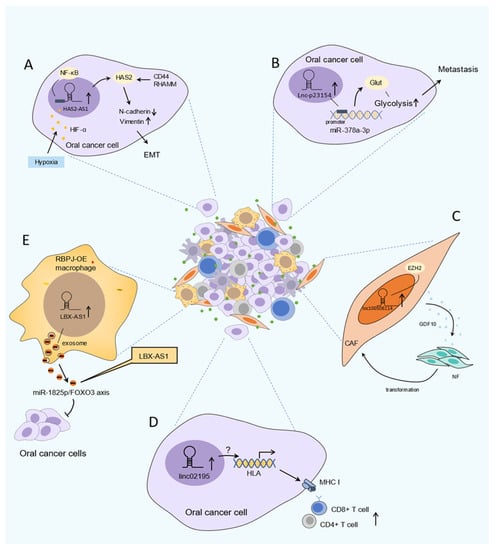 Roles of lncRNA in OSCC tumor microenvironment. (A) Hypoxic TME. HAS2-AS1 activates NF-κB in response to HIF-1α induced by microenvironment hypoxia, leading to HAS2 accumulation in CD44, RHAMM depend-way, which promotes EMT and invasion. (B) Metabolic reprogramming. lncRNA-p23154 promotes GLUT1 expression to enhance glycolysis via binding with the promoter region of miR-378a-3p, leading to increased metastatic potential. (C) CAF transformation. loc100506114 promotes functional transformation of NFs to the phenotype of CAFs by forming a feedback loop with EZH2 to activate CAFs secrete GDF10. (D) Immune regulation. Linc02195 regulates MHC I protein to affect immunosurveillance by being closely associated with high expression of HLA I gene, and it showed a positive correlation between increasing number of infiltrating CD8+T and CD4+T cells. (E) Extracellular vesicles. Exosomal-LBX1-AS1 from RBPJ overexpressed macrophages inhibited the proliferation and invasion of OSCC cells by the miR-182-5p/FOXO3 pathway.