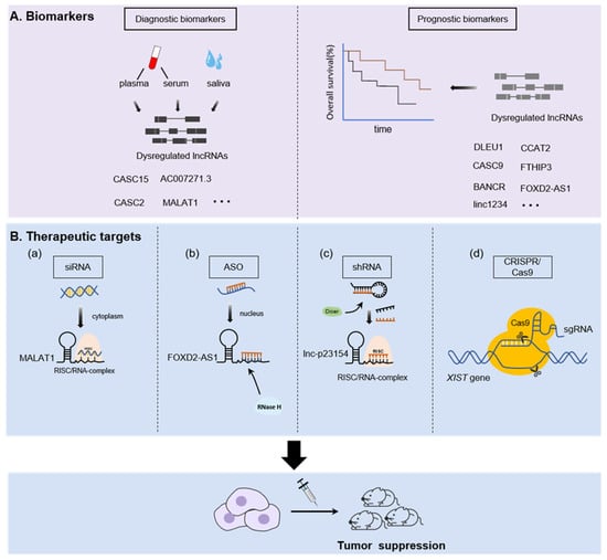 Given the fact that the expression of lncRNAs is tissue/cell specific, and the carcinogenic roles of these lncRNAs are diverse, lncRNAs show promise as attractive targets for drug development and significant implication in clinical application for cancer treatment. Therapeutic approaches that accurately target lncRNAs may exert anti-tumor effects. Emerging advanced lncRNA-based techniques such as antisense oligonucleotides (ASOs), small interfering RNAs (siRNAs), short hairpin RNAs (shRNAs), aptamers, and CRISPR-Cas9, have revealed that targeting specific lncRNAs can effectively inhibit OSCC growth, migration, and invasion in vitro and in vivo [].