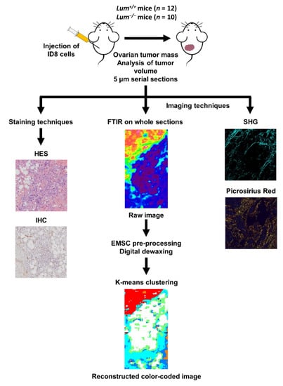 Nizet, P.; Untereiner, V.; Sockalingum, G.D.; Proult, I.; Terryn, C.; Jeanne, A.; Nannan, L.; Boulagnon-Rombi, C.; Sellier, C.; Rivet, R.; et al. Assessment of Ovarian Tumor Growth in Wild-Type and Lumican-Deficient Mice: Insights Using Infrared Spectral Imaging, Histopathology, and Immunohistochemistry. Cancers 2021, 13, 5950. https://doi.org/10.3390/cancers13235950