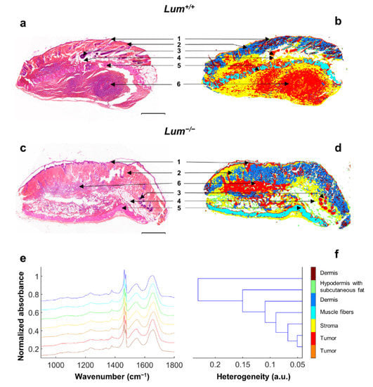 - Nannan, L.; Untereiner, V.; Proult, I.; Boulagnon-Rombi, C.; Colin-Pierre, C.; Sockalingum, G.D.; Brézillon, S. Label-Free Infrared Spectral Histology of Skin Tissue Part I: Impact of Lumican on Extracellular Matrix Integrity. Front. Cell Dev. Biol. 2020, 8, 320. [Google Scholar] [CrossRef]
