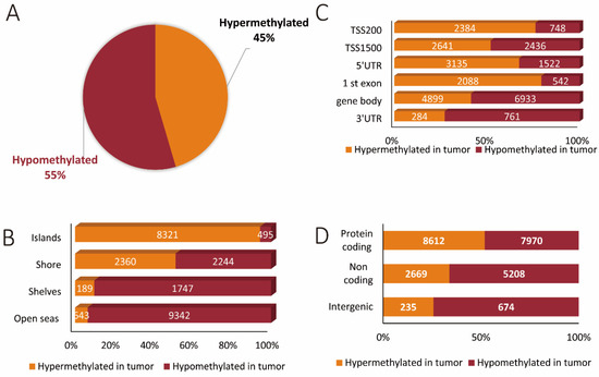 The distribution of methylation changes across the different chromosomes was relatively proportional to chromosome size, with chromosomes 1, 2, 7, and 6 accounting for the most changes. These findings mirror those of other studies that have investigated chromosome and genome-wide methylation profiles [80,81]. Although both hypermethylation and hypomethylation events are common in cancer, the literature indicates that hypomethylation events are slightly more common [82]. Similarly, in our study, we also found both hypermethylation and hypomethylation events in the tumor as compared to normal tissues, with hypomethylation being slightly more predominant, with 55% hypomethylated as compared to 45% hypermethylated sites globally. Interestingly, hypomethylation and hypermethylation events were not evenly spread across genomic features or regions. Over 90% of the hypermethylation changes observed in tumor tissues were located within CpG islands, whereas the exact opposite was evident in open seas. Across all genomic regions, hypomethylation was more predominant with the exception of 3′ UTR and 1st exon regions.