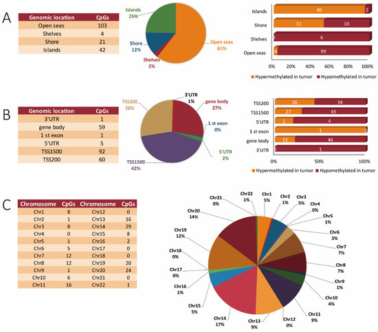 As shown in Figure 1D, the overall changes in DNA methylation were mainly seen within chromosome 1 (8.13%), followed by chromosomes 2 (7.77%) and chromosome 7 (7.48%). The least affected chromosomes were chromosome 9 (1.7%), chromosome 18 and 22 (both 1.1%), and chromosome 21 (0.88%). The global methylation pattern across all chromosomes, including the proportions of both hyper- and hypomethylated CpGs in tumor versus corresponding normal tissue, and their relations to the specific genomic features (islands, shelves, shores, and open seas) is represented in Table 1. Our global analysis shows that methylation changes predominantly affected protein-coding genes. Methylation preferentially occurred within gene bodies, and the chromosomal distribution was relatively proportional to chromosome size, with a few exceptions. The majority of methylation changes were seen on chromosomes 1, 2, 7, 6, 11, 8, 5, 10, 3, 13, 19, 12, and 4, respectively, in decreasing order of magnitude. The other autosomes were less affected, with chromosomes 21, 22, 18, and 9 showing the least changes in their methylation pattern in tumor as compared to normal tissue (Figure 1D).
