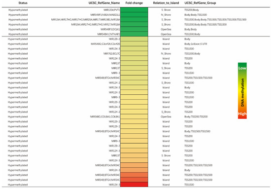 The methylation pattern in miR genes across all chromosomes, including the contribution of both hypermethylated and hypomethylated CpGs, and their context to specific genomic features (islands, shelves shores, and open seas) is represented in Table 2. Interestingly, for miR genes, methylation changes occurred predominantly in promoter regions located within 1500 bp from transcription start sites. In addition, chromosomes 14, 20, and 19 accounted for over 43% of the methylation changes observed for miR genes in tumor versus normal tissue. An interesting observation was that chromosomes that were abundantly affected by methylation changes within the global gene profile were largely unaffected by methylation changes within miR genes. Of note, the chromosomes 4, 12, 17, 18, and 21 showed no methylation changes within miR genes (Table 2).