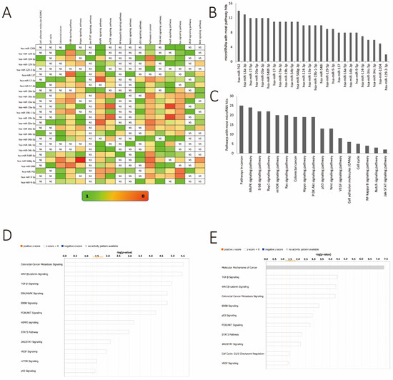KEGG pathway enrichment analysis by using DAVID Ease. (A) Number of genes related to the enriched KEGG pathway. The color of the bar corresponds to log10 (p-value). (B) Bar diagram showcasing miRs regulating the highest number of canonical pathways in descending order. (C) Bar diagram showcasing canonical pathways regulated by the largest number of miRs from the differential methylation list (see Figure 4) in descending order. (D) Ingenuity pathway analysis of targets of hypermethylated miR genes. The threshold line is equivalent to a –log p value of 0.05. (E) Ingenuity pathway analysis of targets of hypomethylated miR genes. The threshold line is equivalent to a –log p value of 0.05.