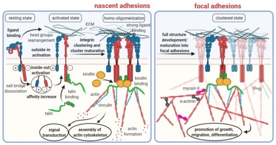 Integrins are a family of cell surface receptors which primarily mediate the binding and physical attachment of cells to various insoluble strand proteins, such as collagen, laminin, fibronectin, vitronectin, and others, that constitute the extracellular matrix (ECM) [1]. As such, they fulfil a pivotal role for tissue connectivity and stiffness [2]. Integrins are transmembrane proteins, i.e., they possess an extracellular domain for binding to their ligands, and an intracellular domain which is mostly connected to the actin filaments forming the cytoskeleton (Figure 1). The intracellular domain is furthermore involved in signaling cascades [3]. On the one hand, factors in the cytosol can induce activation and clustering of integrins (inside–out signaling); on the other hand, ligand binding to integrins can initiate intracellular processes (outside–in signaling), thus underscoring the multitude of biological functions attributed to integrins in general [4].