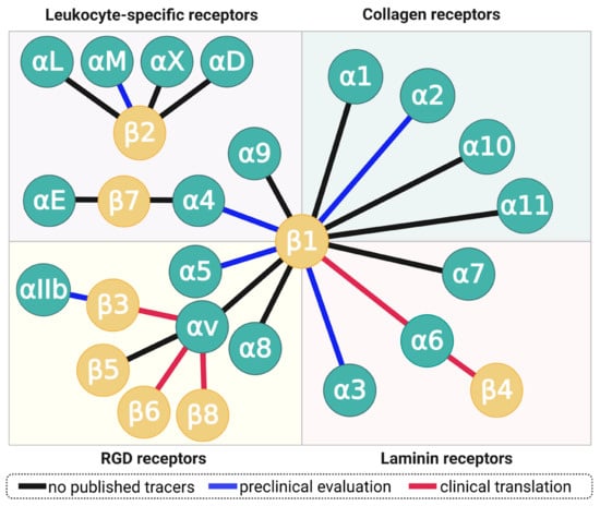 The family integrin receptors. Each connecting line represents an integrin, formed by dimerization of one α- and one β-subunit. Blue lines indicate integrins for which radiolabeled small-molecule ligands, peptides, or peptidomimetics have been characterized in small animals; red lines denote clinical translation, regardless of cohort size (i.e., including single-case applications). Copyright notice: Figure reprinted from EJNMMI Res. 2021, 11, doi:10.1186/s13550-021-00842-2. Steiger et al., There is a world beyond αvβ3-integrin: Multimeric ligands for imaging of the integrin subtypes αvβ6, αvβ8, αvβ3, and α5β1 by positron emission tomography [6]; under Creative Commons CC BY 4.0.