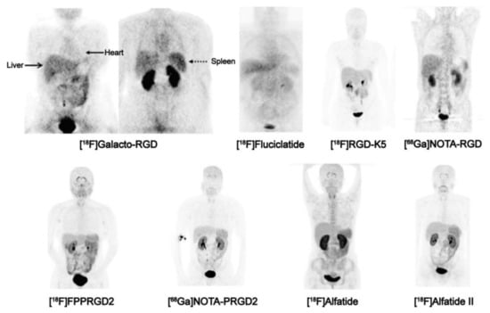 - Beer, A.J.; Haubner, R.; Göbel, M.; Luderschmidt, S.; Spilker, M.E.; Wester, H.J.; Weber, W.A.; Schwaiger, M. Biodistribution and pharmacokinetics of the αvβ3-selective tracer 18F-galacto-RGD in cancer patients. J. Nucl. Med. 2005, 46, 1333–1341. [Google Scholar]