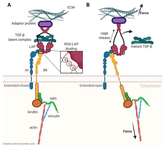 Activation of latent transforming growth factor β (TGF-β) by interaction of αvβ6-integrin with latency-associated peptide (LAP), according to a study by Dong et al. [61]. (A): αvβ6-integrin binds to an RGD motif in LAP. (B): A pulling force transmitted by the β6-subunit deforms LAP and releases TGF-β.