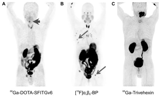 αvβ6-integrin PET imaging in cancer patients (maximum intensity projections, 1 h p.i.) with different radiopharmaceuticals; arrows (wherever shown) indicate tumor lesions. (A): 68Ga-DOTA-SFITGv6 PET of a recurrent hypopharynx tumor. (B): A stage IV invasive mammary carcinoma, imaged using [18F]αvβ6-BP. (C): 68Ga-Trivehexin PET of a large oral squamous cell carcinoma. Copyright notice: Images were adapted and reprinted from: (A) Clin. Cancer Res. 2017, 23, 4170–4180. Altmann et al., Identification of a Novel ITGαvβ6-Binding Peptide Using Protein Separation and Phage Display [94]; and (B) Clin. Cancer Res. 2019, 25, 1206–1215; Hausner et al., Preclinical Development and First-in-Human Imaging of the Integrin αvβ6 with [18F]αvβ6-Binding Peptide in Metastatic Carcinoma [86]; with permission from AACR and not included in CC-BY 4.0 of this article. (C) Eur. J. Nucl. Med. Mol. Imaging 2021, doi:10.1007/s00259-021-05559-x. Quigley et al., PET/CT imaging of head-and-neck and pancreatic cancer in humans by targeting the “Cancer Integrin” αvβ6 with Ga-68-Trivehexin [105]; under Creative Commons CC BY 4.0.