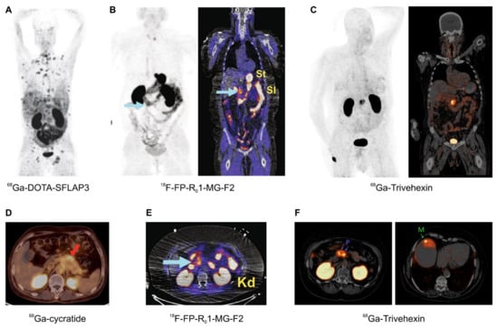 αvβ6-integrin PET/CT imaging in pancreatic cancer (MIPs (A–C), coronal slices (B,C), and axial slices (D–F); (A–E), 1 h p.i.; F, 2 h p.i.); arrows (wherever shown) indicate tumor lesions. (A): Highly metastatic pancreatic carcinoma, imaged using 68Ga-DOTA-SFLAP3. (B,E): MIP and fusion images of a non-metastatic pancreatic carcinoma, obtained using the knottin peptide based tracer 18F-FP-R01-MG-F2. (C,F): 68Ga-Trivehexin PET/CT of a non-metastatic (C) and metastatic (F) PDAC (“P” indicates the primaries, “M” a liver metastasis). (D): Axial fusion PET/CT of a pancreatic cancer obtained with 68Ga-cycratide. Copyright notice: Images were adapted and reprinted from (A) Nuklearmedizin 2019, 58, 309–18. Müller et al., Preclinical evaluation of peptide-based radiotracers for integrin αvβ6-positive pancreatic carcinoma. [97] © Georg Thieme Verlag KG. (B,E) Nat. Commun. 2019, 10, 4673. Kimura et al., Evaluation of integrin αvβ6 cystine knot PET tracers to detect cancer and idiopathic pulmonary fibrosis [93]; (C) Eur. J. Nucl. Med. Mol. Imaging 2021, 48, 4107–4108. Quigley et al., PET/CT imaging of pancreatic carcinoma targeting the “cancer integrin” αvβ6 [106]; and (F) Eur. J. Nucl. Med. Mol. Imaging 2021, doi:10.1007/s00259-021-05559-x. Quigley et al., PET/CT imaging of head-and-neck and pancreatic cancer in humans by targeting the “Cancer Integrin” αvβ6 with Ga-68-Trivehexin [105]; under Creative Commons CC BY 4.0. (D) This research was originally published in JNM. Feng et al., Clinical Translation of a 68Ga-Labeled Integrin αvβ6–Targeting Cyclic Radiotracer for PET Imaging of Pancreatic Cancer. J. Nucl. Med. 2020;61:1461–1467. [98] © SNMMI.