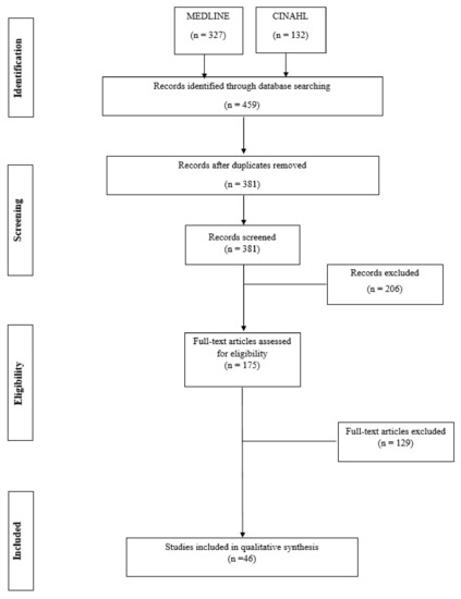 A brief narrative literature review was conducted. A search on MEDLINE and CINAHL was carried out from September 2020 to January 2021, limited to articles written in English from 2000 to 2020, with the following terms in the title: tyrosine kinase inhibitors, multikinase inhibitors, sorafenib, lenvatinib, cabozantinib and vandetanib, combined with (AND) thyroid cancer. Both quantitative and qualitative studies were included. The MEDLINE database produced 327 studies and 132 from the CINAHL database. Duplicates were excluded and led to 381 studies that were read in title and abstract. 206 studies were excluded as irrelevant, and the remaining 175 were read in full text. The screening process led to the selection of 46 studies included in the review (Figure 1). RefWorks® software was used to select the studies.