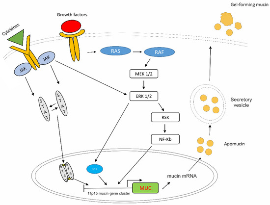 Several factors are involved in the triggering of mucin expression (Figure 2). The inflammatory microenvironment and different tumorigenic pathways have a prominent role in the upregulation of the mucin promoters, which could be used as biological tools for therapy. The 11p15 mucin gene cluster contains the four mucin genes MUC2, MUC5AC, MUC5B and MUC6 [78]. Their promoters are modulated by several transcription factors, among which Sp1, Sp3, AP-1, NF-kB, ATF/CREB and RAR-α and -γ, and by epigenetic mechanisms [79,80,81]. Factors involved in mucin overexpression are proinflammatory and pleiotropic cytokines [interleukin-1beta (IL-1β), IL-4, IL-6, IL-9, IL-13 and tumor necrosis factor-alpha (TNF-α)], growth factors [epidermal growth factor (EGF) and transforming growth factor-α (TGF-α)], hormones (estrogen, T3, glucocorticoids), retinoids and bacterial and lipid mediators (LPS, PAF and PGE2) [80]. It was shown that LPS induces mucin overexpression in epithelial cells through a Src-dependent Ras/Mitogen-Activated Protein Kinase (MAPK)/pp90rsk pathway leading to NF-kB activation [82]. Other intracellular signals that control mucin gene transcription are PKA-, PKC-, PKG- and Ca2+-dependent kinases and MAPK, the last one via EGFR [80].