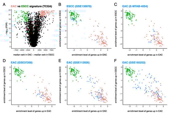 By comparing EAC (n = 72) and ESCC (n = 91) cases from TCGA (Figure 1A), we constructed gene expression signatures (Table S4) of EAC and ESCC composed of 100 genes up in EAC vs. ESCC (EAChi) (shown in red in Figure 1A) and 100 genes up in ESCC vs. EAC (ESCChi) (shown in green in Figure 1A), respectively. The ssGSEA [44] enrichment levels of these 100 EAChi and 100 ESCChi genes were assessed in EAC cases (shown in red in Figures 1B–5D) and ESCC cases (shown in green in Figures 1B–5D) from TCGA, and samples from other datasets (shown in blue in Figures 1B–5D).