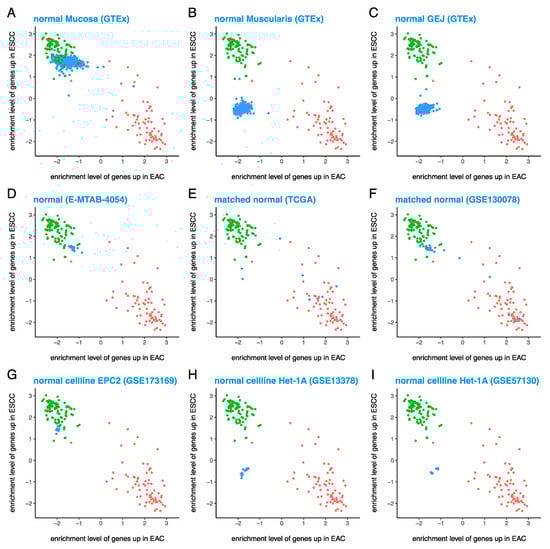 Normal esophageal cell lines are quite similar to tissues derived from various parts of the normal esophagus. Enrichment levels of 100 EAChi and 100 ESCChi genes show that (A) normal esophagus mucosa is ESCC-like, (B) normal esophagus muscularis and (C) normal gastro–esophageal junction are neither EAC-like nor ESCC-like, (D) normal squamous esophagus is ESCC-like similar to normal esophagus mucosa, (E,F) matched normal esophagus from esophageal cancer patients are all over the place, (G) normal esophageal cell line EPC2 is similar to normal esophagus mucosa (ESCC-like), and (H,I) normal esophageal cell line Het-1A is similar to normal esophagus muscularis and normal gastro–esophageal junction (neither EAC-like nor ESCC-like). Red = EAC cases from TCGA, green = ESCC cases from TCGA, and blue = test samples (various types of samples from datasets other than TCGA).
