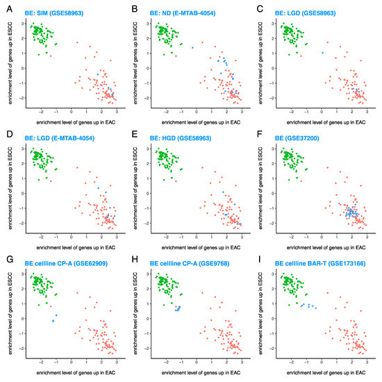 Unlike primary BE tissues, the BE cell line CP-A from GSE62909 [37] (Figure 4G) and GSE9768 (Figure 4H) and the BE cell line BAR-T from GSE173166 [41] (Figure 4I) were surprisingly ESCC-like. These results suggest that unlike primary BE tissues which are EAC-like, BE cell lines are ESCC-like. Thus, BE cell lines are extremely different from primary BE tissues, as BE cell lines have not only a substantially lower enrichment level of the 100 EAChi genes than primary BE tissues (also true for EAC cell lines vs. EAC tumors, but to a much smaller extent), but also a substantially higher enrichment level of the 100 ESCChi genes than primary BE tissues (which is not true for EAC cell lines vs. EAC tumors).