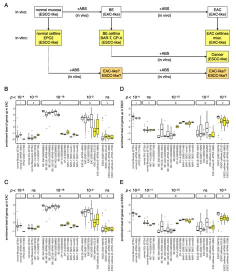 Summary of the main findings of this study. (A) Gatroesopahegal reflux is a known risk factor that changes ESCC-like normal mucosa to EAC-like primary BE tissue, after which it remains EAC-like as further ABS exposure changes it from primary BE tissue to primary EAC tumor. Cell lines made from ESCC-like normal mucosa remains ESCC-like and quite similar to normal mucosa. Cell lines made from the EAC-like primary BE tissue surprisingly becomes ESCC-like and extremely different from primary BE tissue. Cell lines made from primary EAC tumor remains EAC-like but becomes considerably different from primary EAC tumor. Unlike cell lines made from primary EAC tumor which are at least EAC-like, malignantly transformed BE cell lines (due to in vitro ABS exposure) are surprisingly ESCC-like. It will be interesting to see whether in vitro ABS exposure changes the transcriptome of the normal cell line EPC2 from ESCC-like to EAC-like. Enrichment levels of (B) 100 EAChi genes, (C) 500 EAChi genes, (D) 100 ESCChi genes, and (E) 500 ESCChi genes in tissues (white) vs. cell lines (yellow): (i) normal esophagus mucosa and squamous esophagus vs. the normal cell line EPC2, (ii) normal esophagus muscularis and gastro–esophageal junction vs. the normal cell line Het-1A, (iii) primary BE tissues vs. BE cell lines, (iv) EAC tumors vs. EAC cell lines, and (v) ESCC tumors vs. ESCC cell lines. The results show that: (B,C) enrichment level of EAChi genes is (iii) substantially lower in BE cell lines than primary BE tissues and (iv) considerably lower in EAC cell lines than EAC tumors, and (D,E) enrichment level of ESCChi genes is (iii) substantially higher in BE cell lines than primary BE tissues but (iv) not in EAC cell lines than EAC tumors.