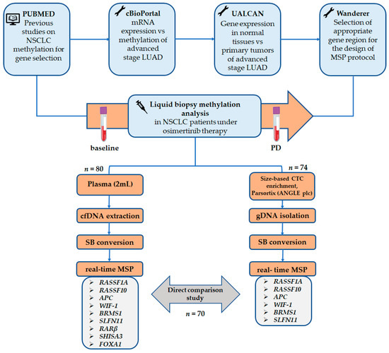 In the present study, we directly compared DNA methylation of nine selected genes in CTCs and paired plasma-cfDNA of NSCLC patients that are longitudinally monitored during osimertinib therapy, to evaluate a potential role in NSCLC progression and EGFR TKI therapy resistance. Our results were derived by highly specific and highly sensitive analytically validated real time MSP molecular assays, following strict preanalytical and analytical quality control steps.