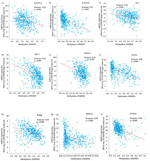 Association between mRNA expression and DNA methylation in lung adenocarcinoma tissues for (A) RASSF1A, (B) RASSF10, (C) APC, (D) WIF-1, (E) BRMS1, (F) SLFN11, (G) RARβ, (H) SHISA3, (I) FOXA1 gene based on TCGA analysis within cBioPortal datasets.