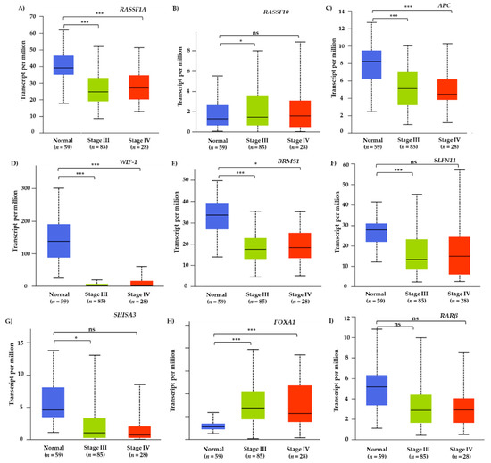 Gene expression levels between normal (n = 59) and stage III (n = 85) or stage IV (n = 28) LUAD tissue samples for (A) RASSF1A, (B) RASSF10, (C) APC, (D) WIF-1, (E) BRMS1, (F) SLFN11, (G) RARβ, (H) SHISA3, (I) FOXA1 gene based on TCGA data from UALCAN web server (***: p < 0.001, * p < 0.05, ns: non-significant).
