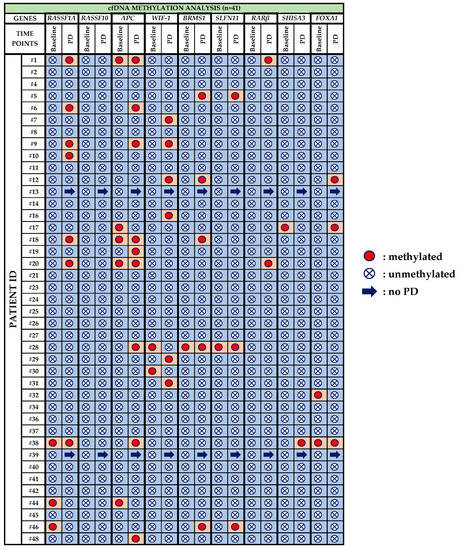 Methylation rates for RASSF1A, APC, WIF-1, FOXA1, RARβ, BRMS1 and SLFN11 were higher at PD compared to that at baseline but without any statistically significant differences. Furthermore, patients found positive for at least one methylation marker were 10/41 (24.4%) at baseline and 17/39 (43.6%) at PD. Interestingly, among those patients carrying more than one methylation marker, the presence of RASSF1A methylation was strongly correlated with the APC methylation (Fisher’s exact test, p < 0.001, k = 0.687). All results on the methylation status of these nine genes in plasma-cfDNA are summarized in Figure 4.