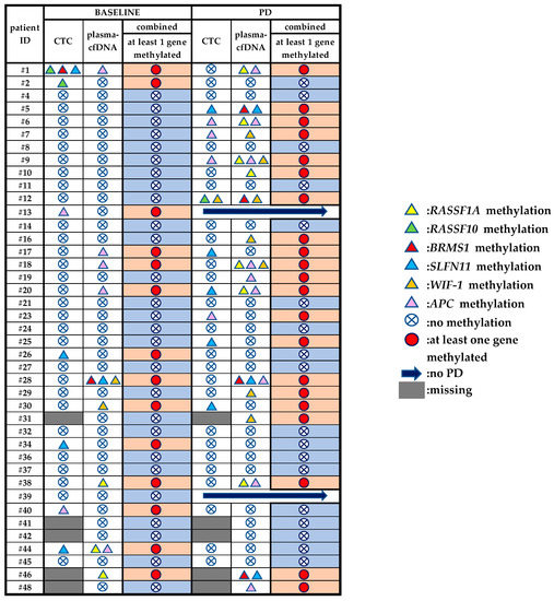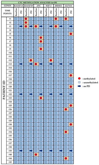 We evaluated in total 70 matched plasma-cfDNA and CTC samples, 36 at baseline and 34 at PD for the methylation of six genes (RASSF1A, RASSF10, APC, WIF-1, BRMS1, SLFN11). At baseline, there was no agreement between plasma-cfDNA and CTCs in terms of methylation, whereas at PD there was an agreement in patient #5 for SLFN11, patients #6 and #9 for APC and patient #12 for WIF-1. Totally different methylation patterns were observed between plasma-cfDNA and CTC matched samples for patients #1 and #44 at baseline and for patients #7 and #20 at PD. Moreover, as can be seen in Table 1, there were patients’ samples positive for various methylation markers solely in CTCs (Pt#2, Pt#13, Pt#17, Pt#23, Pt#25, Pt#26, Pt#30, Pt#34, Pt#40) and others solely in plasma-cfDNA (Pt#1, Pt#10, Pt#16, Pt#20, Pt#28, Pt#30, Pt#38) either at baseline or at PD. All results are shown in Figure 6.