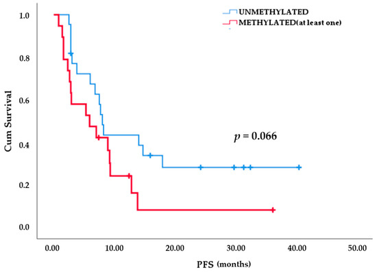 Kaplan-Meier analysis indicated differences in time-to-progression between NSCLC patients that were found methylated for at least one marker at PD in cfDNA and/or CTC and patients that were found negative for DNA methylation of these markers. More specifically patients who were positive for at least one methylated marker tended to progress earlier than those who were negative for DNA methylation for all markers (8.5 vs. 16.7 months, p = 0.066; Figure 7).