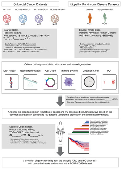 Several pathologies develop with aging. Among those, cancer and neurodegenerative disorders affect (in total) about 41.3 million people worldwide and are a major health problem [1,2]. These two disease groups seem to relate to opposite cellular fate phenotypes, which contribute to the pathological development. While cancer is linked to increased cellular proliferation and resistance to apoptosis, neurodegeneration involves the progressive death of neuronal cells [3]. In particular, tumorigenesis is characterized by the disruption of key molecular events, defined as the hallmarks of cancer [4]. These include aberrant cellular proliferation, resistance to cell death, induction of angiogenesis and metastasis, altered cellular energetics and evading immune system response. Neurodegeneration, on the other hand, is characterized by the excessive loss and malfunctioning of neurons, induced cell death and proteopathies such as accumulation of misfolded proteins [5]. The placement of neurodegeneration and cancer at seemingly opposite ends of specific disease mechanisms is further evidenced by the inverse correlation between cancer incidence and neurodegenerative disorders like PD that has been reported in a number of epidemiological studies [6,7,8]. However, more recently, it has been reported that PD patients are at greater risk of certain types of neoplasms, particularly of melanoma and brain cancer [9], suggesting putatively shared pathological mechanisms. In both diseases, the pathological development process requires a multistep accumulation of events that lead to irreversible cellular changes, as it is expressed in a linear relationship between age and increased incidence rate [10]. The hallmarks of physiologic aging and neurodegeneration include genomic instability, telomere attrition, epigenetic alterations, loss of proteostasis, deregulated nutrient sensing, mitochondrial dysfunction, cellular senescence, stem cell exhaustion, and altered intercellular communication [11,12]. Many of these processes are also relevant to tumorigenesis [3,6,13,14]. Genetic forms of PD are particularly interesting in this overlap. Parkin, an E3-ubiquitin ligase that regulates protein metabolism, mitochondrial function, mitophagy and redox homeostasis, responsible for one of the most common familial forms of PD and also implicated in IPD (PD of unknown genetic origin), is mutated in many somatic cancers, where it seems to act as a tumour suppressor gene [15]. Other genes implicated in genetic forms of Parkinsonism, like PINK1 (PTEN-induced kinase 1), LRRK2 (Leucine-rich repeat kinase 2), PARK7 (Parkinsonism associated deglycase, also known as DJ-1) have also been shown to be relevant in the development of neoplasms, where they interfere in the regulation of processes such as cell cycle, apoptosis, mitochondrial homeostasis and oxidative stress. SNCA which encodes for α-synuclein in humans is one of the main proteins linked to Lewy bodies, which constitute the neuropathological hallmark of PD. Interestingly, α-synuclein is overexpressed in melanoma and other cancers. On the other hand, genes primarily implicated in cancer-related pathways, such as TP53, MTOR, TSC1/2, PIN1, MC1R and the PTEN pathways, have also been shown to be implicated in PD pathogenesis [16]. Thus, increasing evidence points to the disruption of common cellular events in both cancer and PD [2,3,4,5], but the mechanisms underlying these associations require further studies. These mechanisms include the regulation of cell cycle, DNA repair, immune response and redox homeostasis [3,6,13,14]. Recent work from our group using time series data for an in vitro model of colorectal cancer (CRC) progression pointed to a link between cancer and neurodegenerative diseases, involving the circadian system [17], and suggested that altered oscillatory patterns of cancer-associated genes may also be involved in neurodegeneration in Huntington’s disease, but also revealed differential enrichment of genes involved in Alzheimer’s disease and PD.