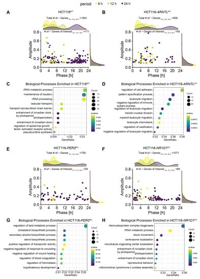 To identify highly represented biological processes for rhythmic genes in HCT116WT and KO conditions, we performed an enrichment analysis using the 24-h (Figure 2C,D,G,H) and 12-h rhythmic genes (Figure S2). The top 10 GO biological process in HCT116WT and in HCT116-NR1D1KO showed an enrichment of genes involved in entrainment of circadian rhythms and RNA processing (Figure 2C,H). In HCT116-ARNTLKO (Figure 2D), the majority of top enriched biological processes were related to immune system and cell motility, whereas in HCT116-PER2KO (Figure 2G) metabolic processes and angiogenesis pathways were among the top listed enriched biological pathways. For 12-h rhythmic genes, our analysis showed an enrichment of metabolic processes in HCT116WT (Figure S2A) and HCT116-NR1D1KO (Figure S2D), which are processes known to be rhythmic with shorter periods [33,61], whereas developmental processes were enriched in HCT116-ARNTLKO (Figure S2B) and HCT116-PER2KO (Figure S2C).