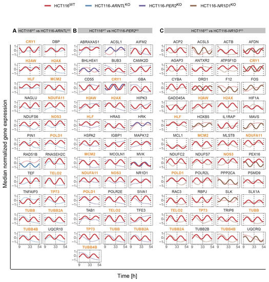 Circadian expression profiles of genes of interest detected as differentially rhythmic in all HCT116 KOs. (A) in HCT116WT and HCT116-ARNTLKO (B) in HCT116WT and HCT116-PER2KO (C) in HCT116WT and HCT116-NR1D1KO. Significantly rhythmic genes (q < 0.05; relative amplitude ≥ 0.1) are depicted using a harmonic regression curve (full lines); not significantly rhythmic genes are depicted with LOESS (Locally Estimated Scatterplot Smoothing) (dashed lines) (see Figure S3 for similar analysis in SW480 and SW620 cells). Common differentially rhythmic genes across all KO cells, as compared to the WT, are marked in orange.