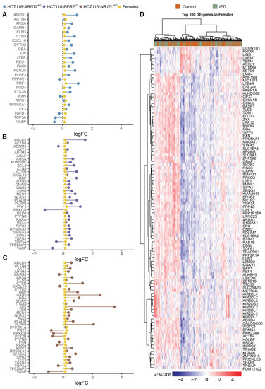 Commonly differentially expressed genes of interest in HCT116 KOs and female IPD patients. Lollipop plots show the direction of changes (up/downregulation) in mean expression levels (log2 FC in comparison to respective controls) for the genes of interest shared between (A) HCT116-ARNTLKO versus HCT116WT and female IPD patients versus respective controls; (B) HCT116-PER2KO versus HCT116WT and female IPD patients versus respective controls; (C) HCT116-NR1D1KO versus HCT116WT and female IPD patients versus respective controls. (D) Heatmap of top 100 differentially expressed genes (sorted by p-value) for IPD female patients. The heatmap was clustered using WardD2 linkage and Euclidean distancing. Disease status is depicted as orange for controls and green for patients. Colour code scheme for standardized gene expression values (z-scores) are indicated in the heatmap colour key (see Figures S7–S9 for similar analysis in males).