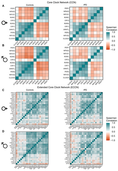 Next, we investigated potential alterations in the expression of CCN and ECCN elements in the IPD cohort. DBP, a clock gene and a member of the family of PAR BZIP transcription factors, was differentially expressed in the female patients versus the respective control group (p = 0.002, log2FC = 0.146, Figure S10). We could not find ECCN elements to be differentially expressed in the full cohort (Figure S11) nor in male patients (Figure S12). We additionally performed a correlation analysis for the CCN and the ECCN elements in the IPD cohort data sets. The determined Spearman correlation coefficient was compared with the reference correlation values for the CCN and ECCN genes in the control groups and visualized using correlation matrices ordered based on the pattern of the control male subjects, for comparison (Figure 6A–D). The IPD male and the female patients showed a weaker correlation for both the CCN and the ECCN elements, compared to the respective control groups, as indicated by the Spearman coefficients (Figure 6A–D). To avoid redundancy between elements of the CCN and of the ECCN gene list, only the genes which are not part of the CCN were visualized in the ECCN correlation heatmaps (Figure 6C,D). Within the CCN, one set of genes (CLOCK, NR1D2, PER2, ARNTL, CRY1, RORA) showed positive correlation within the group, and negative correlation with the other set of genes (CRY2, RORC, NR1D1, NPAS2, PER1) in the IPD and control group. For the ECCN, CSNK1D, NFIL3, ALAS1, PARP1, CREBBP, BHLHE40, GSK3B, CSNK2A1, EP300, CREB1, PRKAA1, SIRT1, FBXL3, NONO, and PRKCA showed the strongest positive correlation within the group, and weaker or negative correlation with the second set of genes (PPARA, TEF, CSNK1E, WDR5, TNF, DBP) in the IPD and in the control groups (Figure 6C,D). BTRC showed negative correlation with all other genes within the ECCN, both for IPD patients as well as for the control groups. Although the pattern of correlation was qualitatively similar among the different groups, there was a weaker correlation among ECCN elements as suggested by the overall decrease in the Spearman correlation coefficients for the cohort of IPD patients (both for males and females) compared to the respective controls, which points to a dysregulation of the circadian clock network associated with the disease. This data also highlights the need for investigating the role for the circadian clock in IPD by generating time-course data sets to monitor possible alterations in the circadian expression of relevant genes in IPD progression.